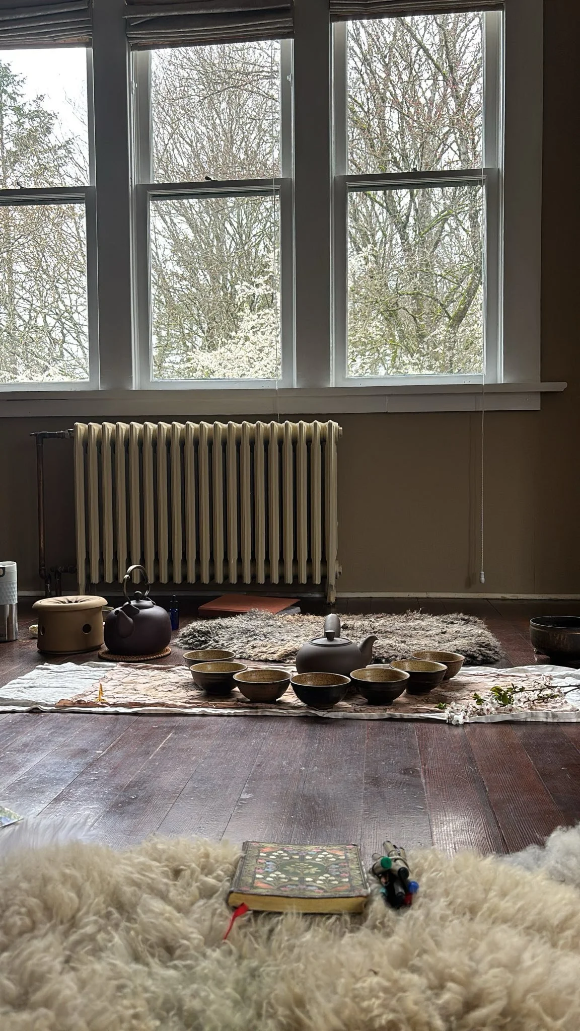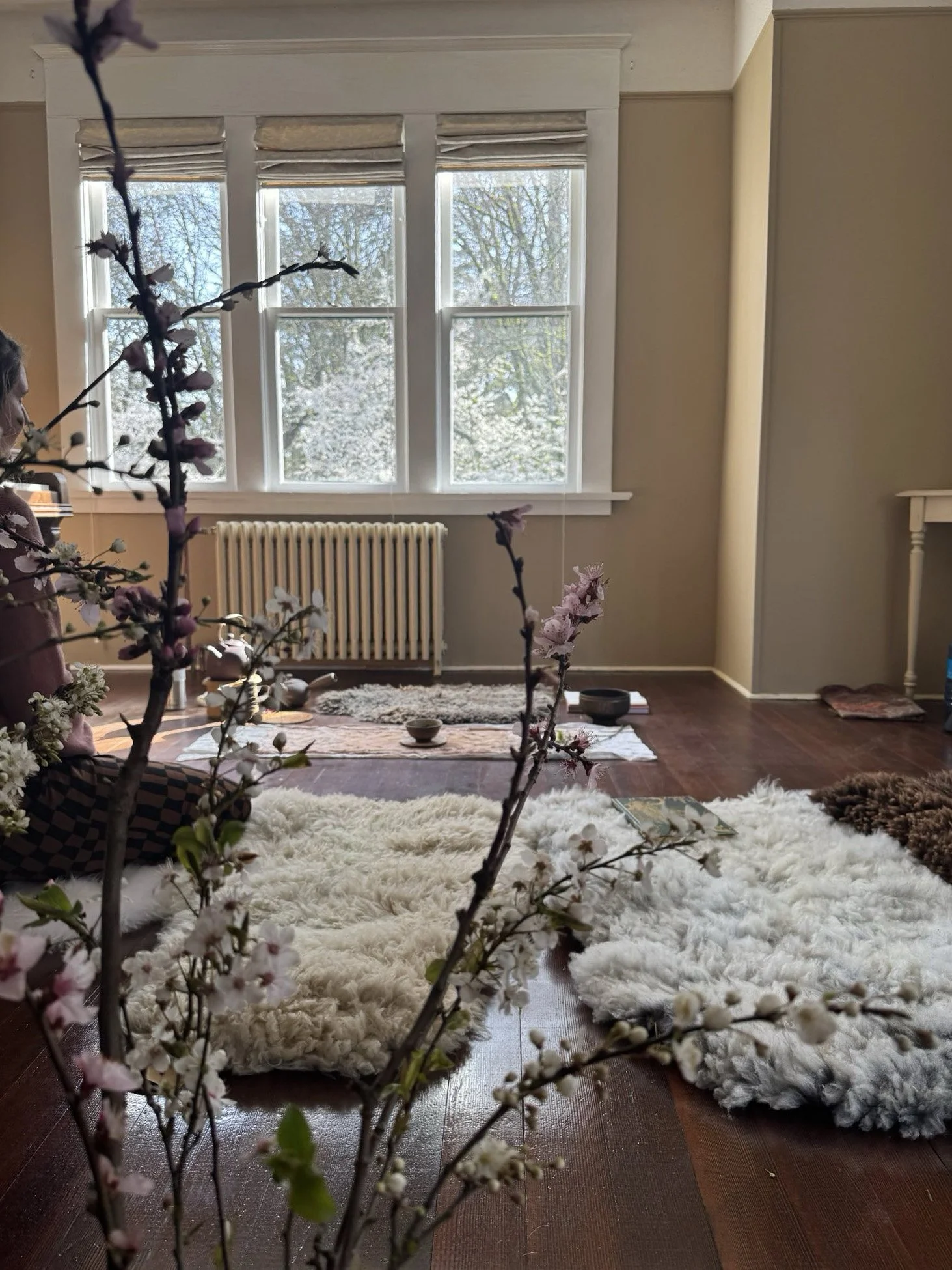 The Parlour of the Farmhouse is a brightly lit 30x30’ space. It has an ambient electric fireplace, a private enclosed porch, and an antique piano. Use our natural sheepskin rugs and benches for your class or gathering.